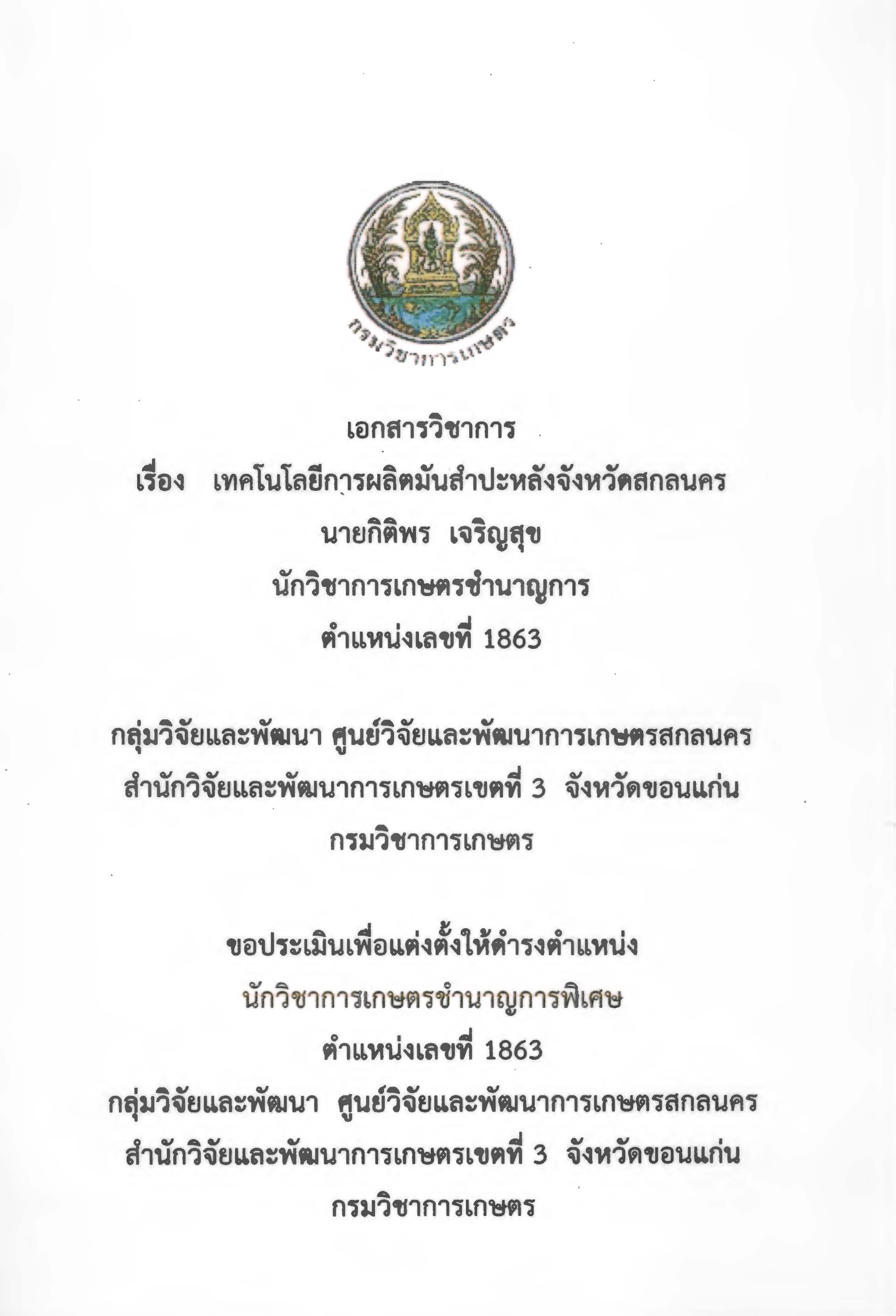 เทคโนโลยีการผลิตมันสำปะหลังจังหวัดสกลนคร : เอกสารวิชาการ กิติพร เจริญสุข